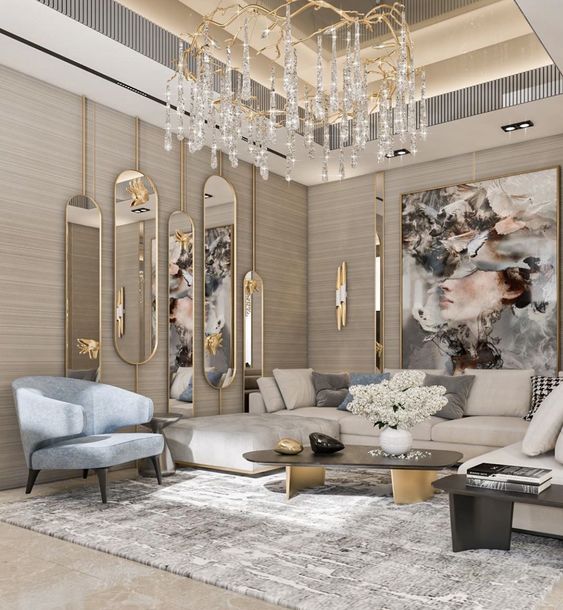 A simple and luxurious appearance can also be seen from the living room in the picture above. The use of white and gray colors gives the living room an elegant look and feel. A little touch of gold on the table legs and chandeliers shows the expensive and classy side of this room.