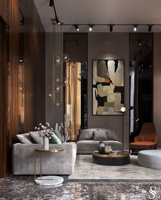 The presence of black in the painting gives a bold element to the living room. It is suitable for living rooms with dark and luxurious nuances. The spotlight that leads to the painting makes the painting clearly visible.
