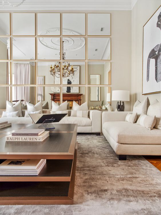If you want to mirror all one side of the living room wall, you can make the image above as a reference. The square mirrors that are neatly attached to the wall look really attractive. The room also looks brighter and more luxurious.