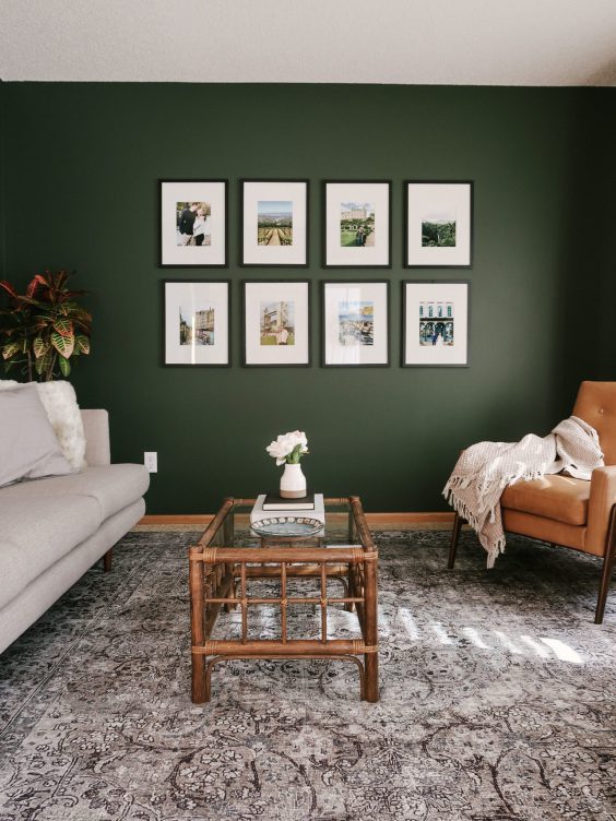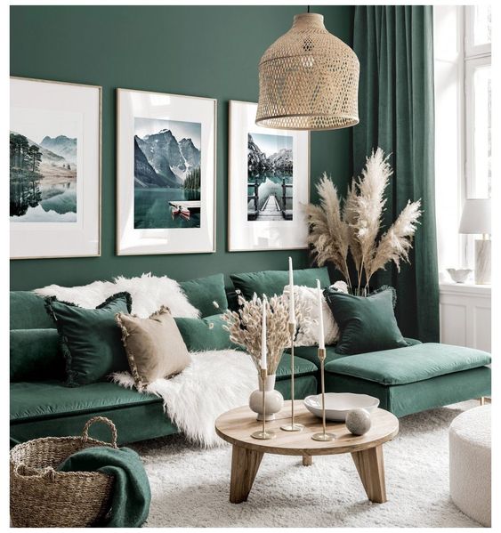 Wall decoration is very necessary to make the room look stiff. Gallery walls are a great idea and a way to make dark and bold colored living rooms look attractive. Do not forget to give a black frame to the photo you print so that it looks perfect on the wall with dark green paint.