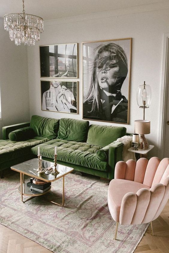 The sweet and feminine look comes from the pink color in the room. A 1 seat pink velvet sofa complements this living room. Here you can see a combination of pink and green that looks so perfect.