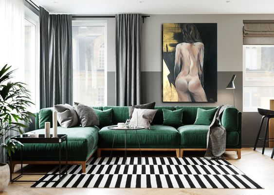For a mature and bold look, choose a gray rug. Gray and green are the perfect combination for modern living room designs.