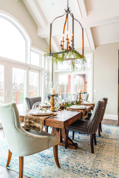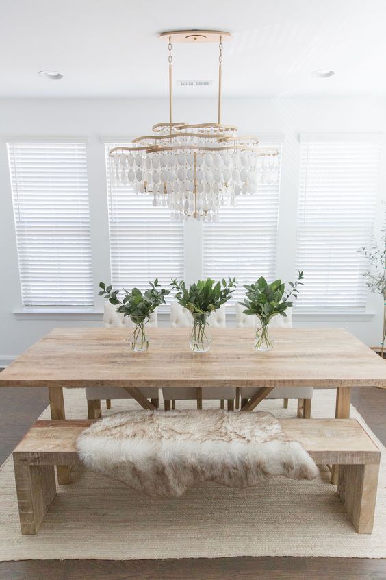 This one is perfect for a Christmas atmosphere. The Farmhouse chandelier gives a calm and warm impression to the dining room so that the dining room will be soothing and comfortable. Coupled with the olive garland decoration on the farmhouse chandeliers giving a fresh green look to the dining room.