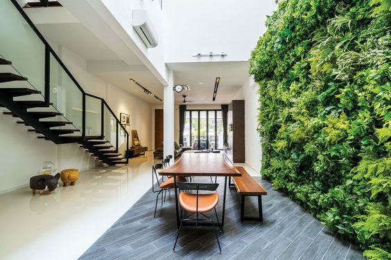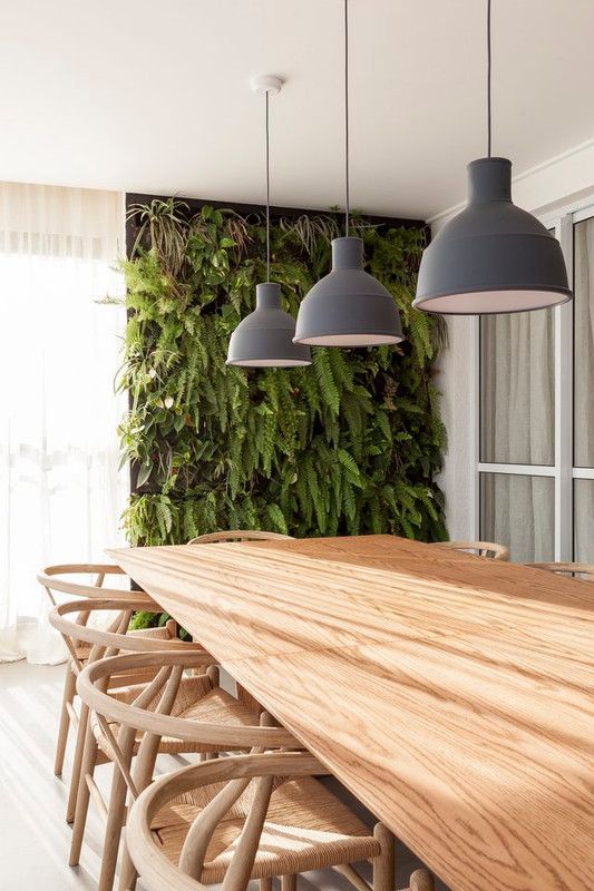It’s an interesting idea to apply a vertical to a modern dining room. The fresh green appearance makes this room appear even more perfect. The serenity in the dining room can be felt clearly.