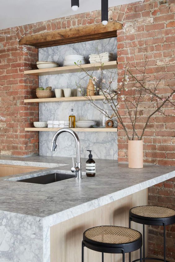 Want to have a kitchen with a soothing natural look? Applying the exposed brick wall is the best idea. The exposed brick wall in the kitchen gives a calm and natural feel. The red color of the brick wall looks so natural that the kitchen does not look tacky or quirky.