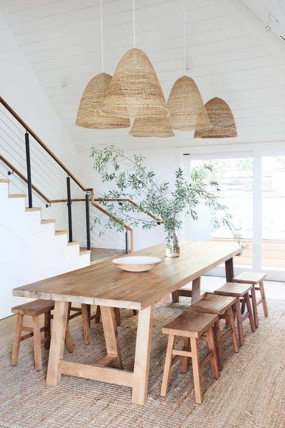 Rattan has a flexible texture so it is very easy to shape into various items, such as carpet and rattan lamp shades. The use of rattan lampshades and rattan carpet makes the white dining room look soft and beautiful.
