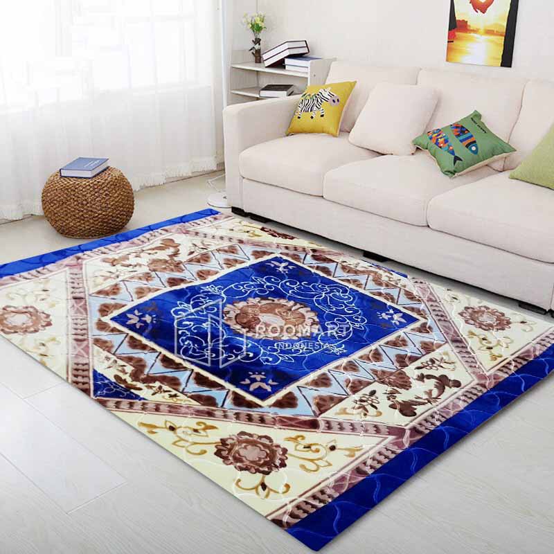 This blue floral pattern carpet is perfect for a minimalist living room decoration. The blue color with floral motifs makes the heart calm and comfortable in this living room. Then, making the living room more attractive, the floor carpet is adjusted to the color of the bright white sofa sets. With decorations like this, the combination of sofa sets and floor carpet with floral motifs looks very harmonious. Then, the presence of sofa cushions adds this room that looks beautiful and alive, so that it makes you feel at home in this living room.