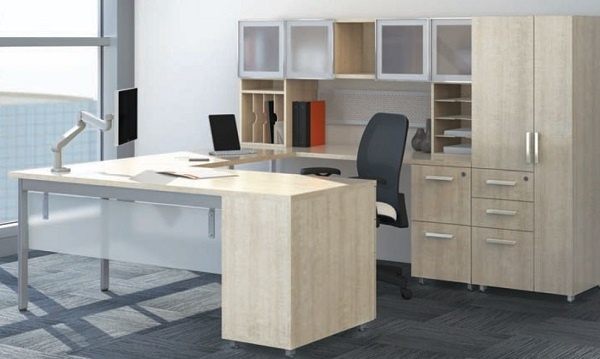 Like this picture above, the table is made with an L model and without drawers. With this simple model, staff will be more flexible to move and arrange the location of their work documents. Meanwhile, for document storage, you can use a wooden filing cabinet like this picture.