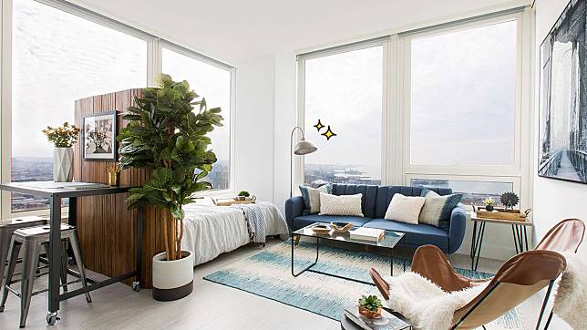 Do you like relaxing while eating and drinking? If so, then this living room design is perfect for you. As seen in the picture above, there are small bar and lounge chairs for you to drink comfortably in the living room area of ​​the apartment. That way, you will have a minibar that you can use to enjoy the weekend while drinking and eating with your family.
