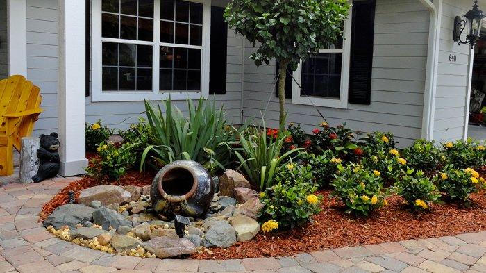 For this one garden, the design seems very pleasant. This small garden has inspired by autumn. This small garden has decorated with neatly arranged natural stones, flowers planted in the middle of natural stones. Then the garden model is made of opal with natural stone decoration motifs. This design makes the front exterior of the house look clean and attractive. The advantages of this small garden make everyone happy. Therefore, do not make other designs in this park because this park has been made well.