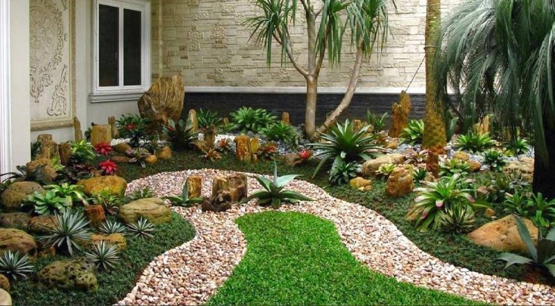 Therefore, you can make your small garden with natural stones, flowers, and other interesting accessories. In addition, you can also make your luxurious garden complete with beautiful small natural stone motifs and grass-like in this picture.