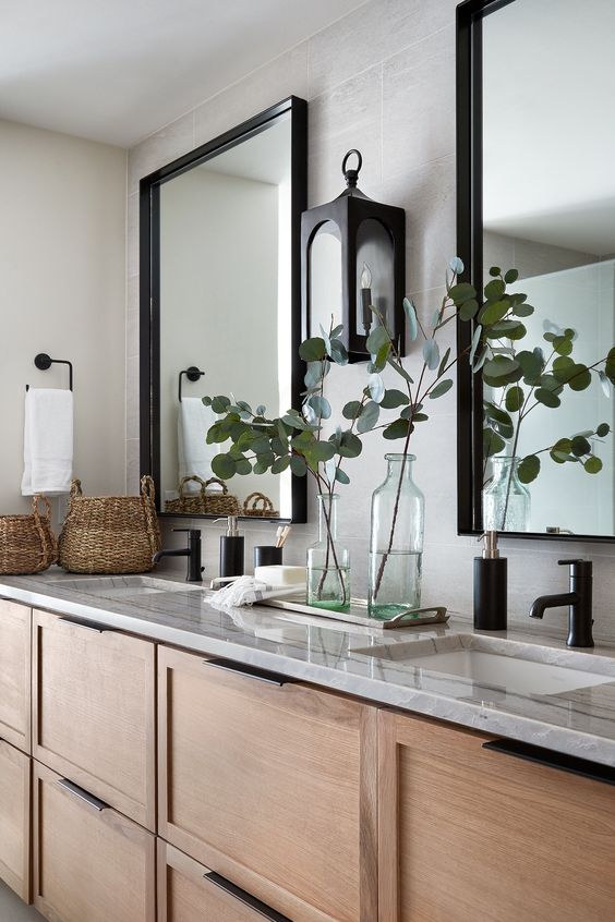 To make the bathroom look fresh, you can use one large and wide mirror, or you can also use two mirrors like in the picture above. A large mirror is also able to make a small bathroom look and feel more spacious.