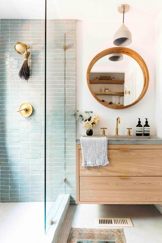 To make the bathroom look fresh, vanity made from wood can be an option. The color of the wood will bring a natural feel to the bathroom so the bathroom not only looks fresh but also looks so calming.