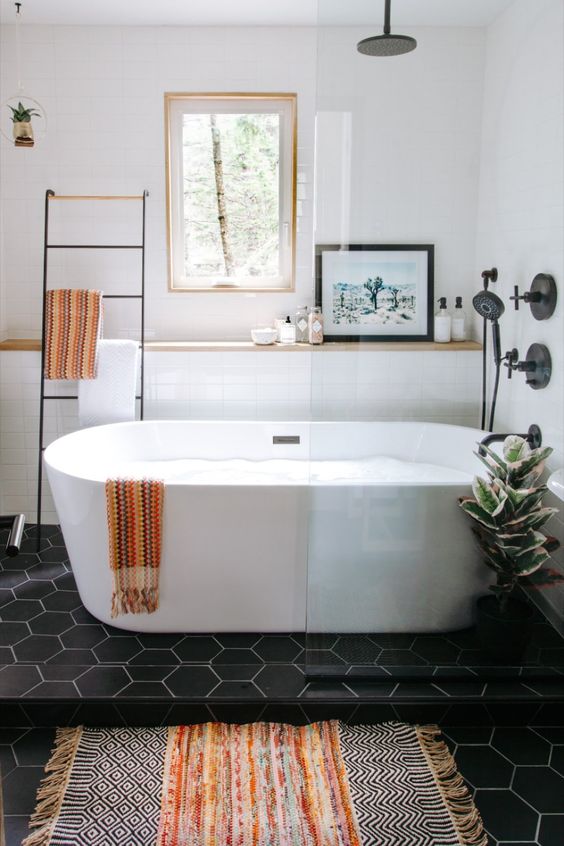 The use of the dominant white color does make the room look bright. However, this will also make the room look stiff. So that the bathroom becomes a cozy place, give motifs with neutral colors like black.