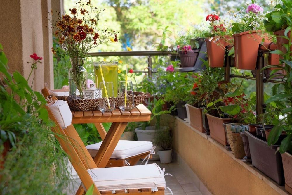 You can use the vertical space of the balcony wall to create a vertical garden, such as planting varieties of herbs, flowers, and vegetables. As a variation, you can hang potted plants on the balcony ceiling to save space. Then, you can also plant a small tree to give a green impression on your balcony, and at the same time, add privacy to your place.