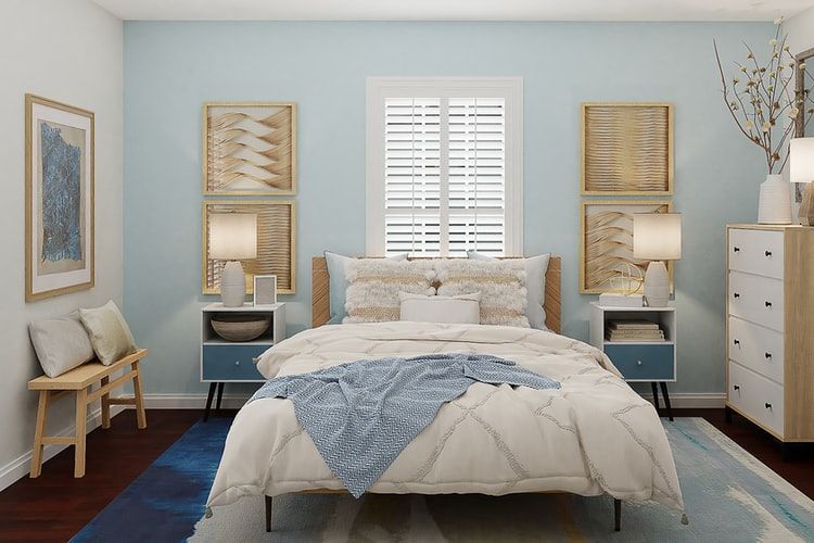Then, you can see the bed, small wardrobe, decorative lights, wall paintings, accessories, and paint on the walls, making this minimalist bedroom interior look beautiful and luxurious. That way, you will be happy and comfortable in this room. Hopefully, you can make this decoration!