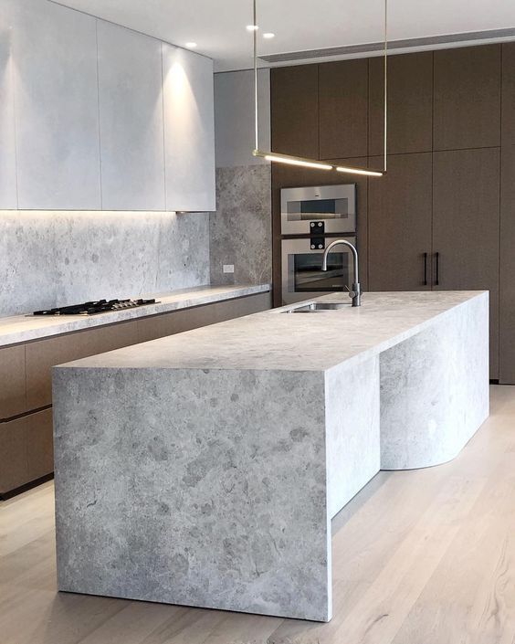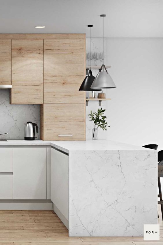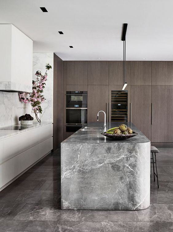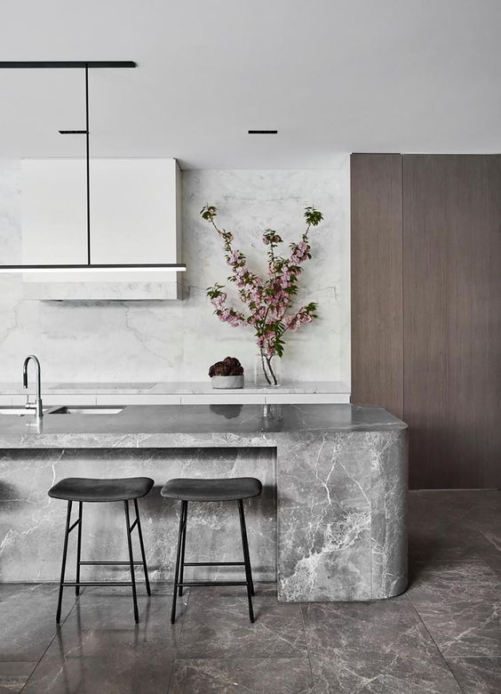 For making the appearance of the minimalist kitchen look light and dark, you could use the marble in different color. White and grey is the best color combination.