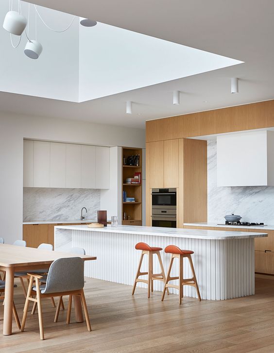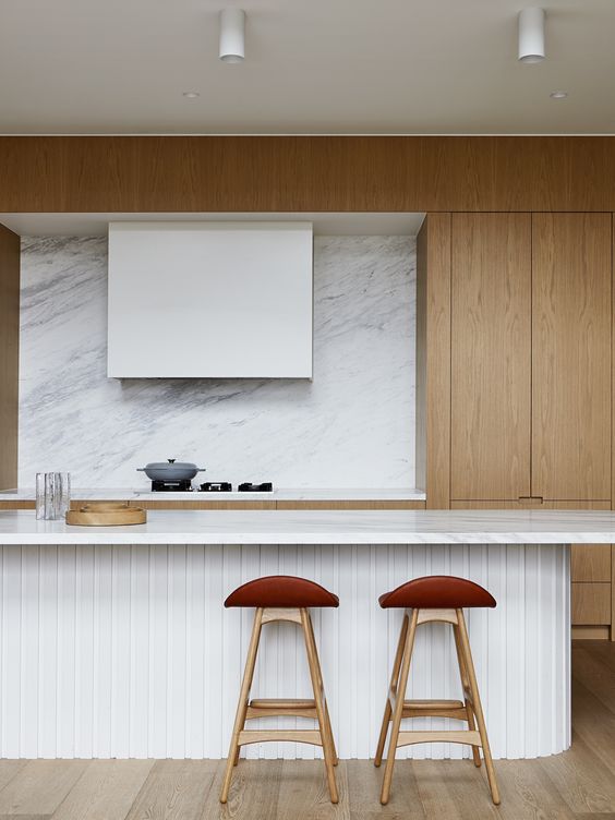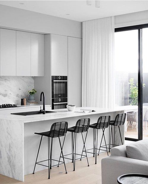 The black and white appearance will make the kitchen look monochrome. You can make the kitchen look sleeks and look warm by adding a touch of wood to the kitchen.
