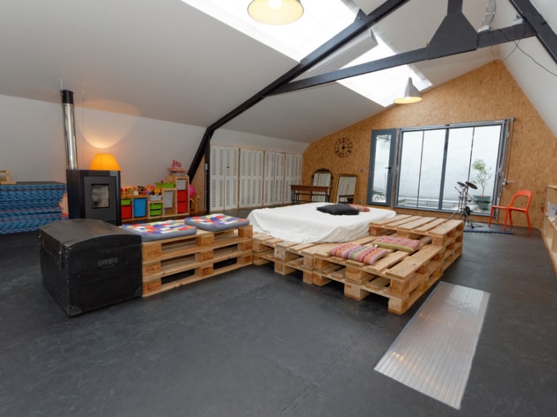 The concrete floor and wooden pallet bed make your room look stiff. You can give a little touch by using the items that have a bright color, such as red, green, etc. In this way, the appearance of your room looks a little bit soft.