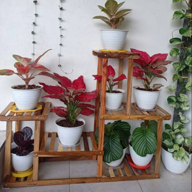 This teak wood flower rack decoration can be the perfect idea to display a room with a classic impression. With a color combination, flowers and teak wood shelves, making your home interior decoration and design more beautiful and fun.