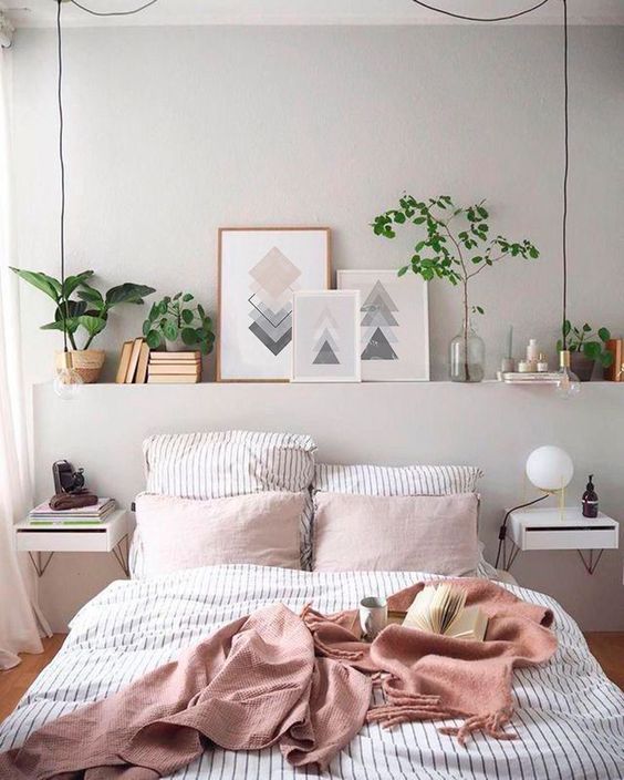 If you like your bedroom look and feel fresh, bringing the plant into the room is the right decoration. You can put the small plants on the floating wall shelf.