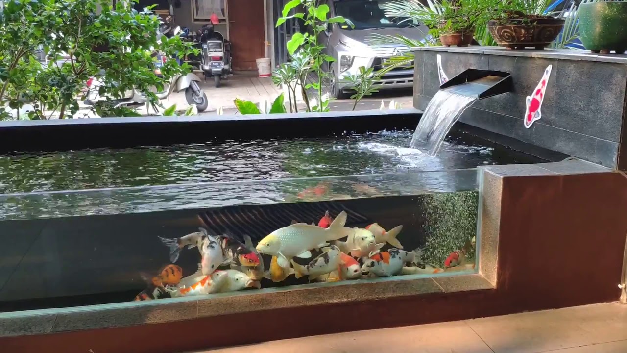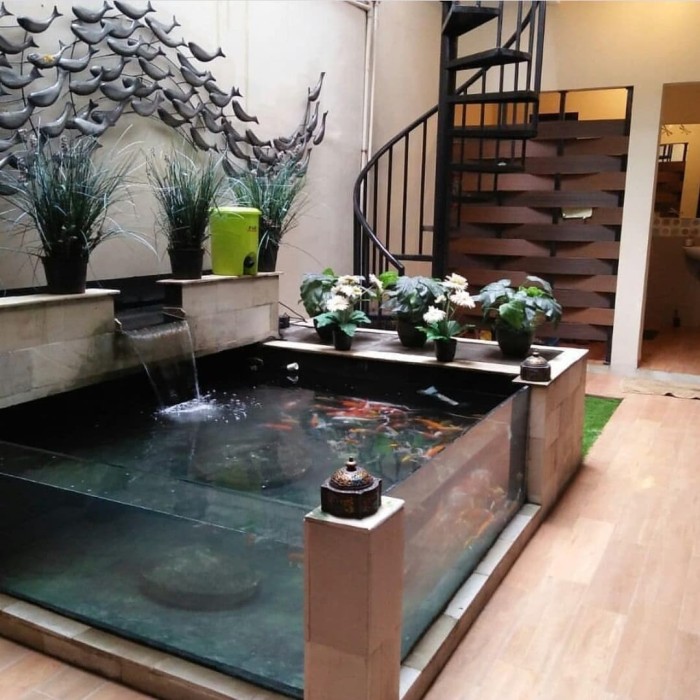 If you want to see your fish all the time, you can make them at home. This glass fish pond uses thick glass and is not easily broken. Then the fish pond walls are decorated with accessories and fountains and make it feel like a big pool. So that it doesn’t look monotonous, the edge of the fish pond is decorated with plants and planted in small flower pots.