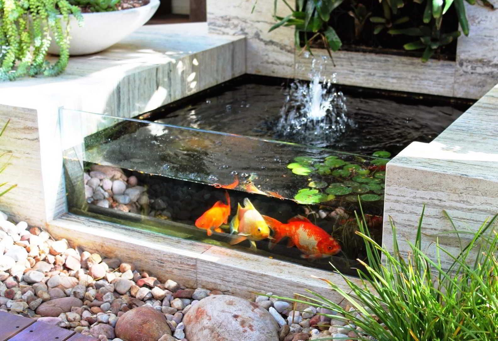 Not all fish ponds have made with natural stone and river stone. This fish pond looks unique and is made of ceramic combined with thick glass. This fish pond looks more fun because you can see fish swimming from the side of the glass like in an aquarium.