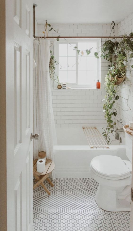 Fresh and Beautiful Small Bathroom with Hanging Plants Decor