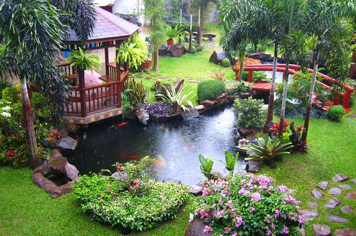 In this picture, you can see, the fish pond is made like a small river and is equipped with a bridge, thus making the backyard garden of this house beautiful and pleasant. Of course, this fish pond is perfect for making a backyard garden. Then the appearance of the fish pond in the garden makes your home more beautiful and comfortable.