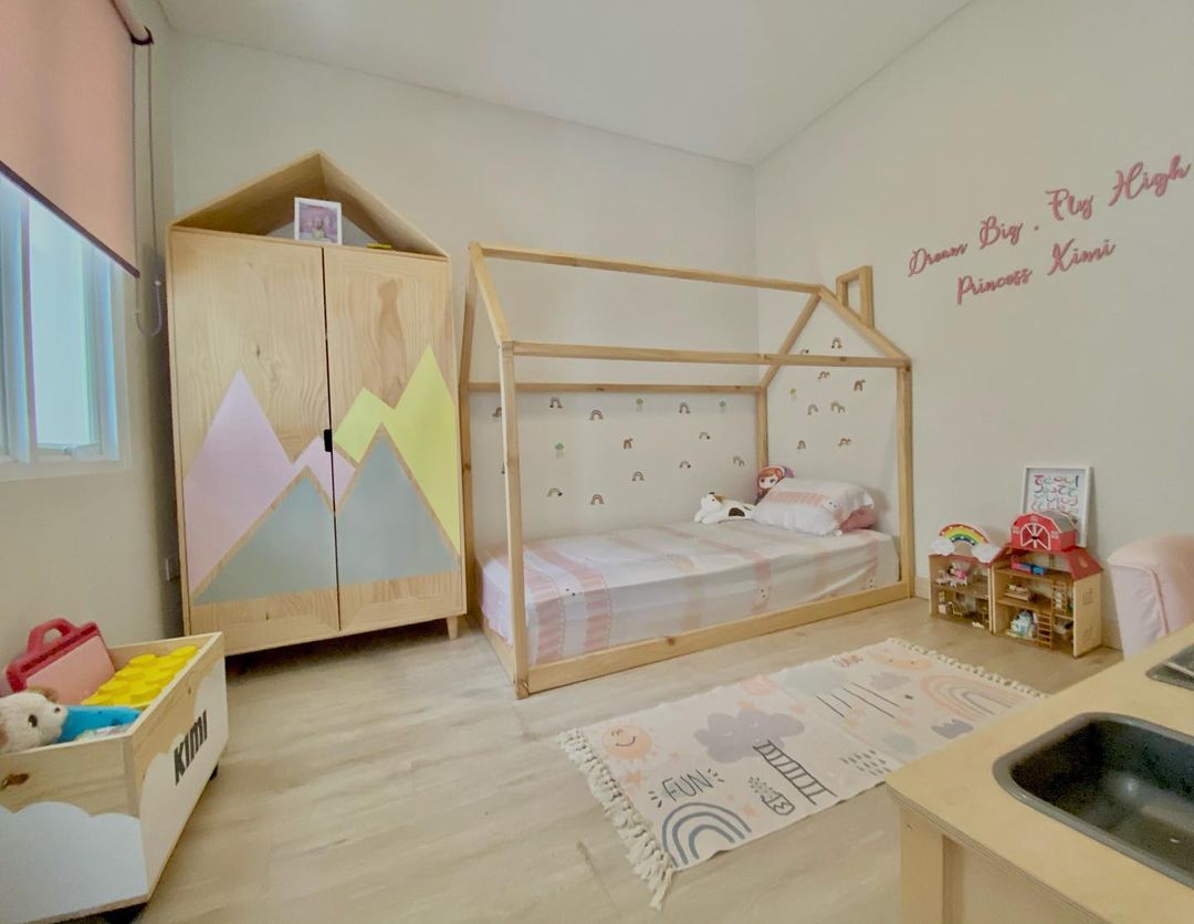 The soft color combination in a child’s bedroom in this picture looks very harmonious. The arrangement of bedroom equipment such as a house model bed complete with foam mattress, wardrobe, and children’s toy rack makes this room look very harmonious.