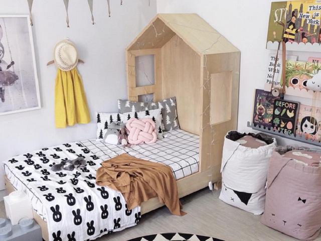Another inspiration that inspired a Scandinavian style children’s bedroom is the combination of bright wall color with a wooden bed designed like a ship. This color is the hallmark of Scandinavian bedroom colors. With the presence of a wooden ship model bed, some writings that are supportive of children’s intelligence, beautiful pillows, and bright colors of the room, make this room look more attractive and fun. But you still supervise your child, so they don’t fall while playing in bed.