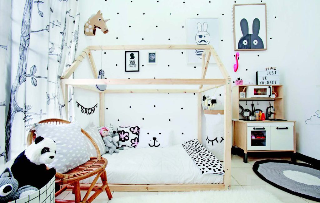 This bright bedroom with a beaded design on the wall looks very attractive. Then the arrangement of the house model bed, children’s toy shelf, rattan chairs, and beautiful panda dolls make this room look cheerful. We believe that your child will be happy to be in this room. With variations on the walls, the children feel like they stay in a playground.