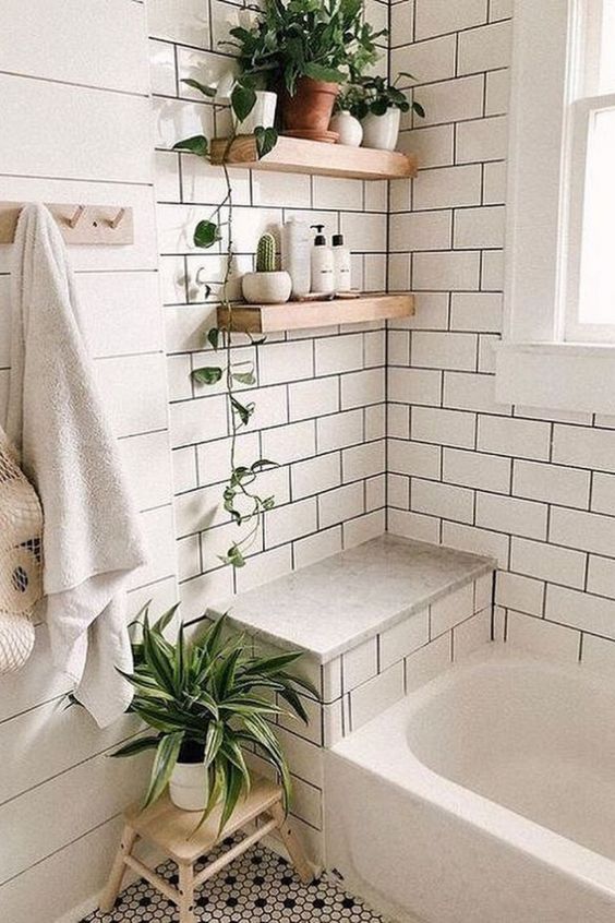 Floating wall shelf is the most appropriate item to use. By using this item, you can put some decorations in the form of pictures, plants, and so on. In addition, the floating wall shelf can also be used as a storage to store toiletries such as soap and shampoo.