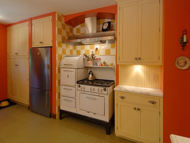 This vintage kitchen comes with maximizing a variety of striking colors that adorn the vintage kitchen space. Even though it carries a vintage concept, this style looks modern. But you can still feel the classic feel in this Historic Beach House Renovation kitchen. You can see this kitchen has equipped with a large old-fashioned refrigerator, gas stove set, and an old-style kitchen set. With this design, the vintage kitchen looks modern and comfortable.