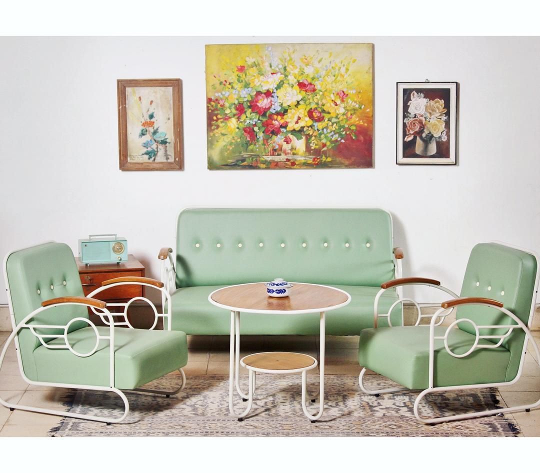 This minimalist living room is suitable for placing a vintage design sofa set. This sofa design features a combination of an iron frame and foam. Then, this living room is designed with bright colors to match the vintage sofa set model. However, to decorate it, you still have to match the color of your small living room. That way, the green and white sofa model will match the color of your living room.