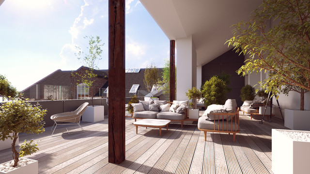 In this article, we want to share ideas to help make your terrace with a Scandinavian design and loved by your family. This picture shows a large terrace decorated with flowers and small trees and a swimming pool so that this place looks like a city park terrace. You can also enjoy your terrace garden and gather with your family. But, if you want to make a terrace like this picture, you must have a lot of inspiration and a lot of money, so you can make it.