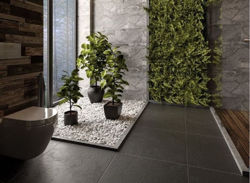 The atmosphere in this room looks beautiful and comfortable. Then the presence of a small garden in this picture looks simple but attractive. The walls of this garden are designed with luxurious natural stones and white pebbles so that the room becomes more beautiful.