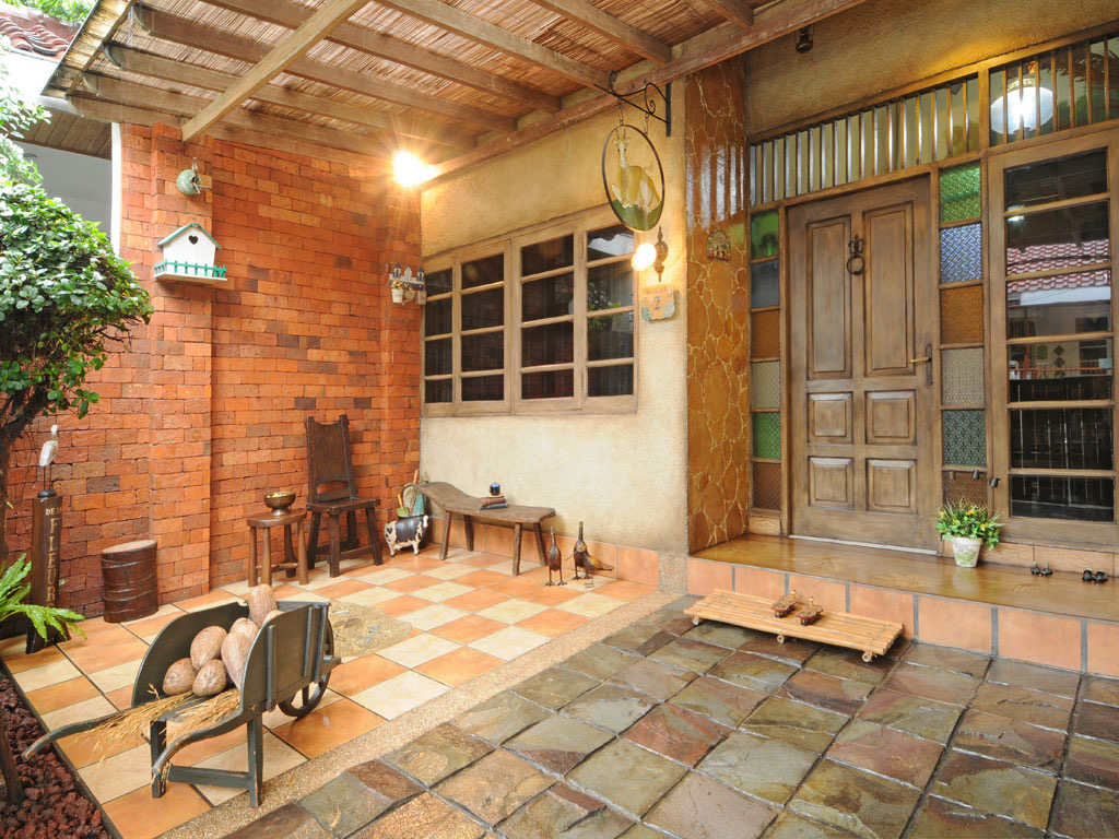 To realize your dream, you should make the backyard of your house with exposed brick-like in the picture. As you can see, the appearance of the terrace is beautiful and pleasant, and the presence of wooden furniture and decorations of various flowers around the back yard make the house more attractive and fun.