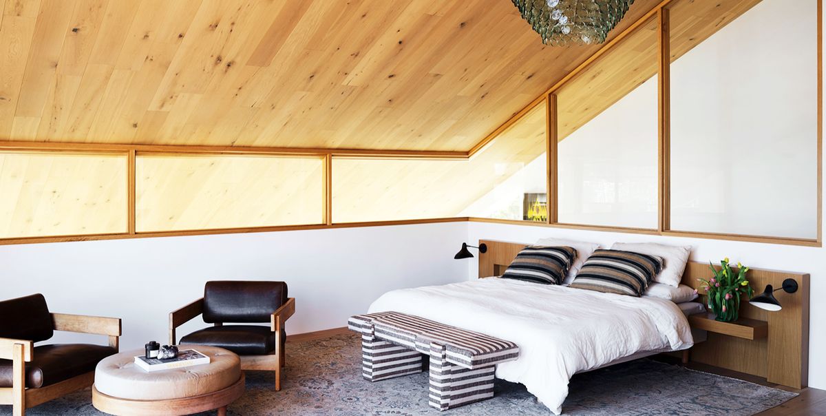 Modern wooden bedroom style using beautiful lacquered wooden objects and a combination of the roof over with glass windows makes this room look classic as the countryside.