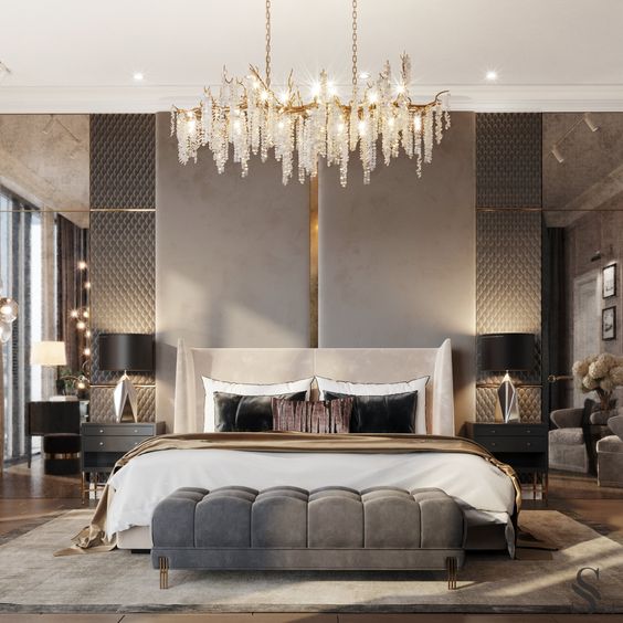 The large bedroom also can be made looks luxurious and elegant. You just need to hang the crystal chandelier in the middle of the room.