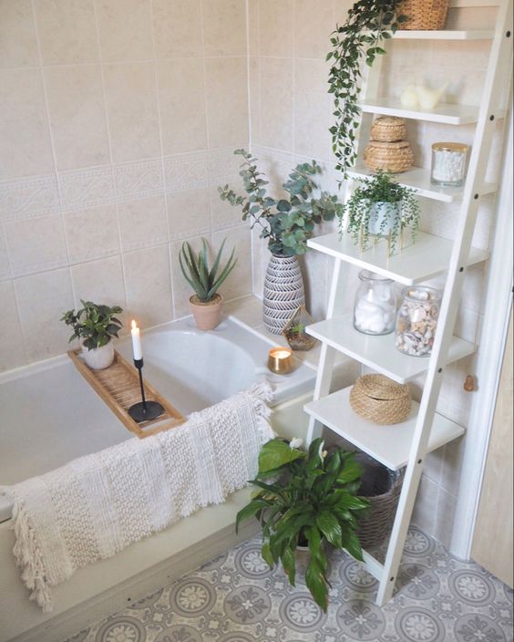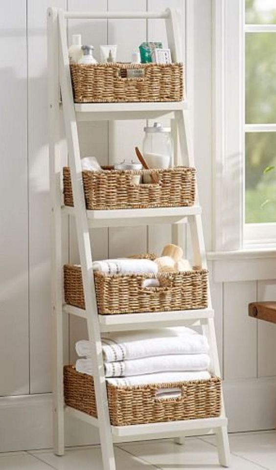 On this ladder shelf you can store some bathroom stuff such as towels, tissue, shampoo and soap bottles, and so on. You can also use a rattan basket to put the bathroom stuff in to make it look more organized and tidier.
