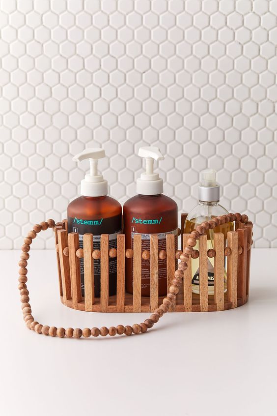 To make it more practical and also make the bathroom look tidy is to use a hanging wood basket. You can hang it on the wall near the bathtub or hang it in the shower.