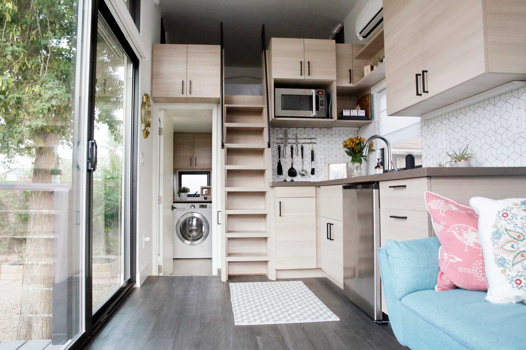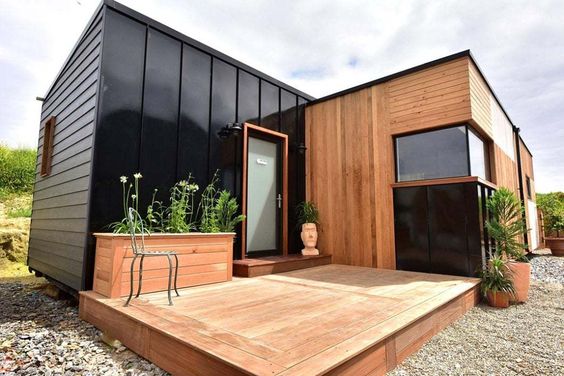 The use of glass doors and windows in tiny houses can make tiny houses look naturally bright. Natural light is great for keeping tiny houses away from feeling cramped and stuffy. And also, bringing excess natural light to a small house is one way to make a small house feel wider.