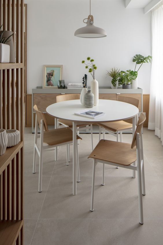 Using plants as a dining room in a Japanese Scandinavian style is the right idea. The presence of plants in this room makes it look and feel fresher. The green color will blend with the wood elements and provide warmth and comfort to the room. Plus the use of natural lighting provides a natural feel that is very fitting to make this room very comfortable.