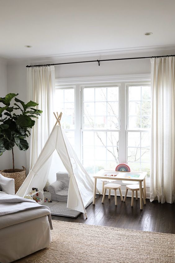 As can be seen from the picture above, the corner of the room is the chosen place to create a cozy playing space in the living room. By making a small tent in the corner of the living room, children will automatically play there.